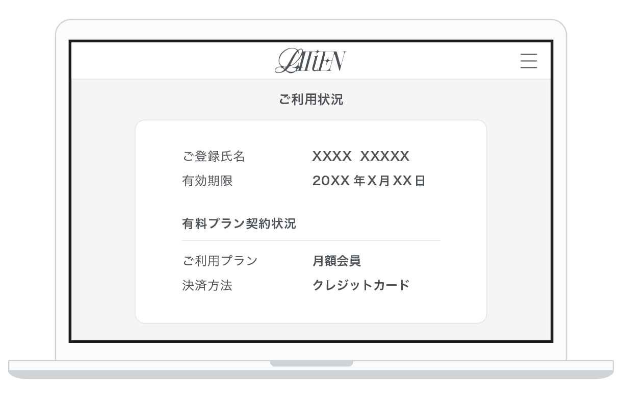 「決済のお申し込み受付」画面から自動的にマイページ内の「ご利用状況」に移動します。有効期限、有料プラン契約状況などが確認できましたら、お支払い手続きの完了とともにLIIiEN オフィシャルファンクラブへの入会完了となります。